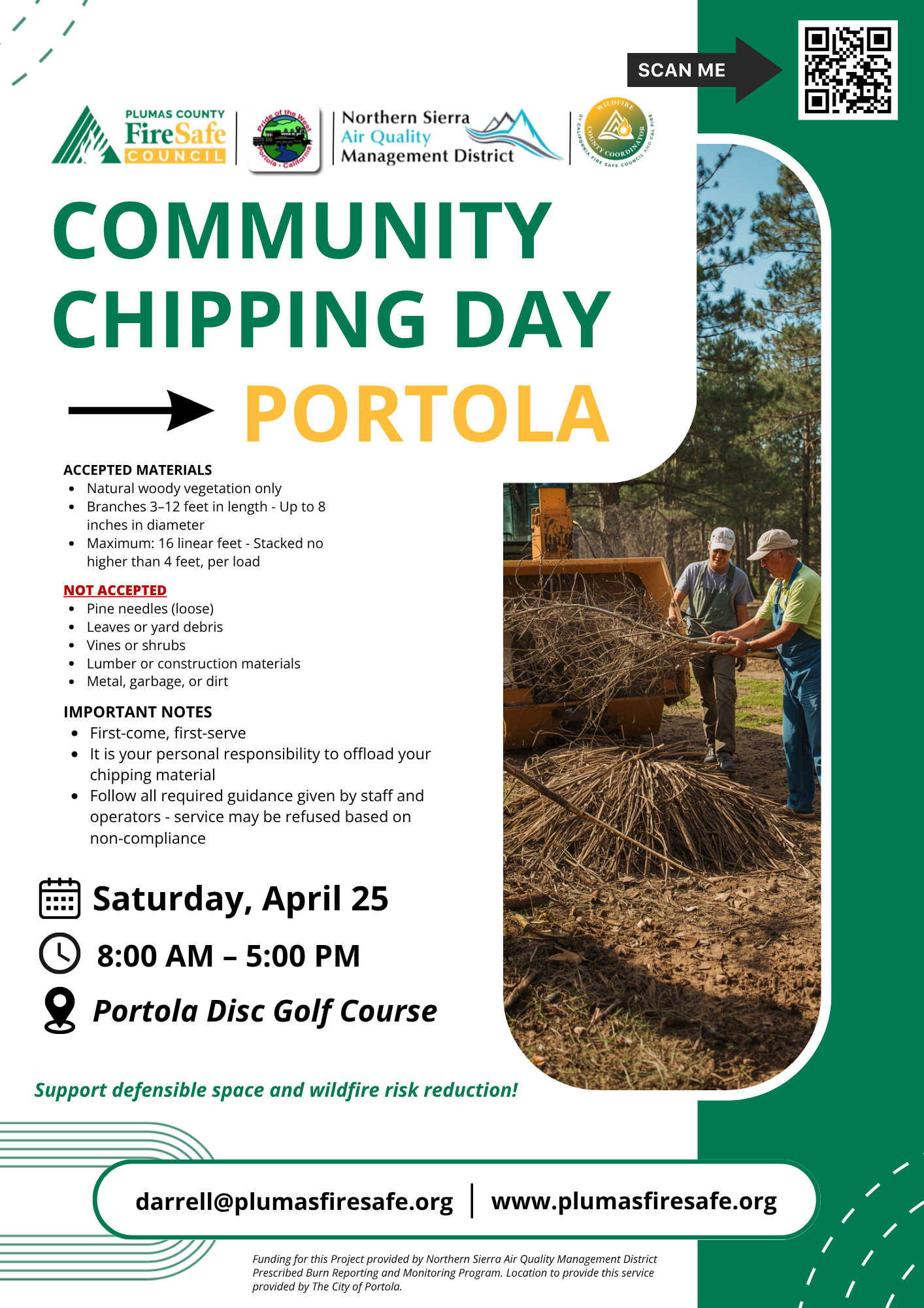 The Plumas County Fire Safe Council, in partnership with the Northern Sierra Air Quality Management District and the City of Portola, is hosting a community chipping day for Portola-area residents. Bring your woody material to Disc Golf Course entrance (next to the former Headwaters Bistro, 620 E Sierra Ave, Portola, CA 96122), and our crew will chip it on site, at no cost to residents.
